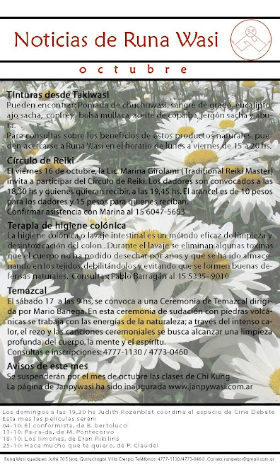 Miércoles 13 de octubre a las 19.00hs. CUPOS LIMITADOS. Solo con inscripción al 4777- 1130 ó runawasi@gmail.com